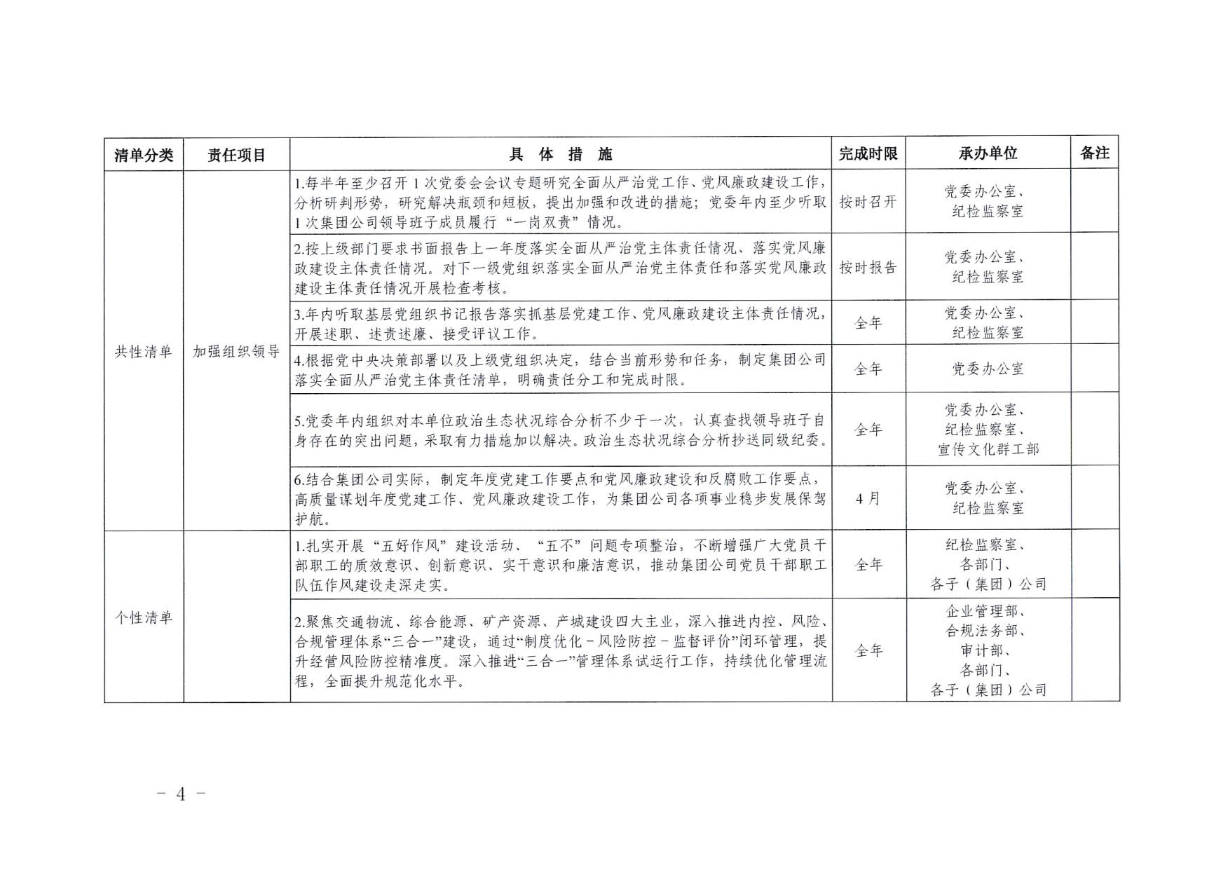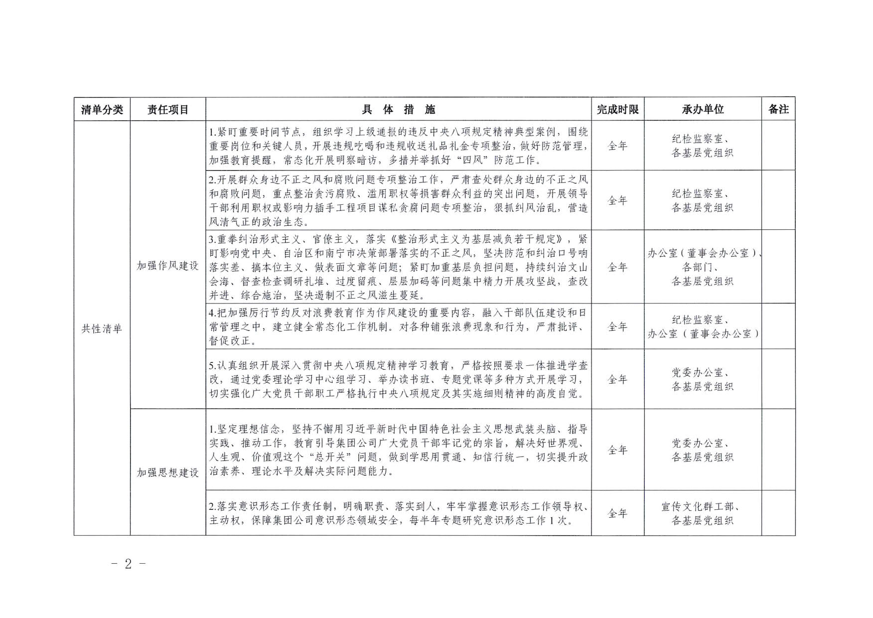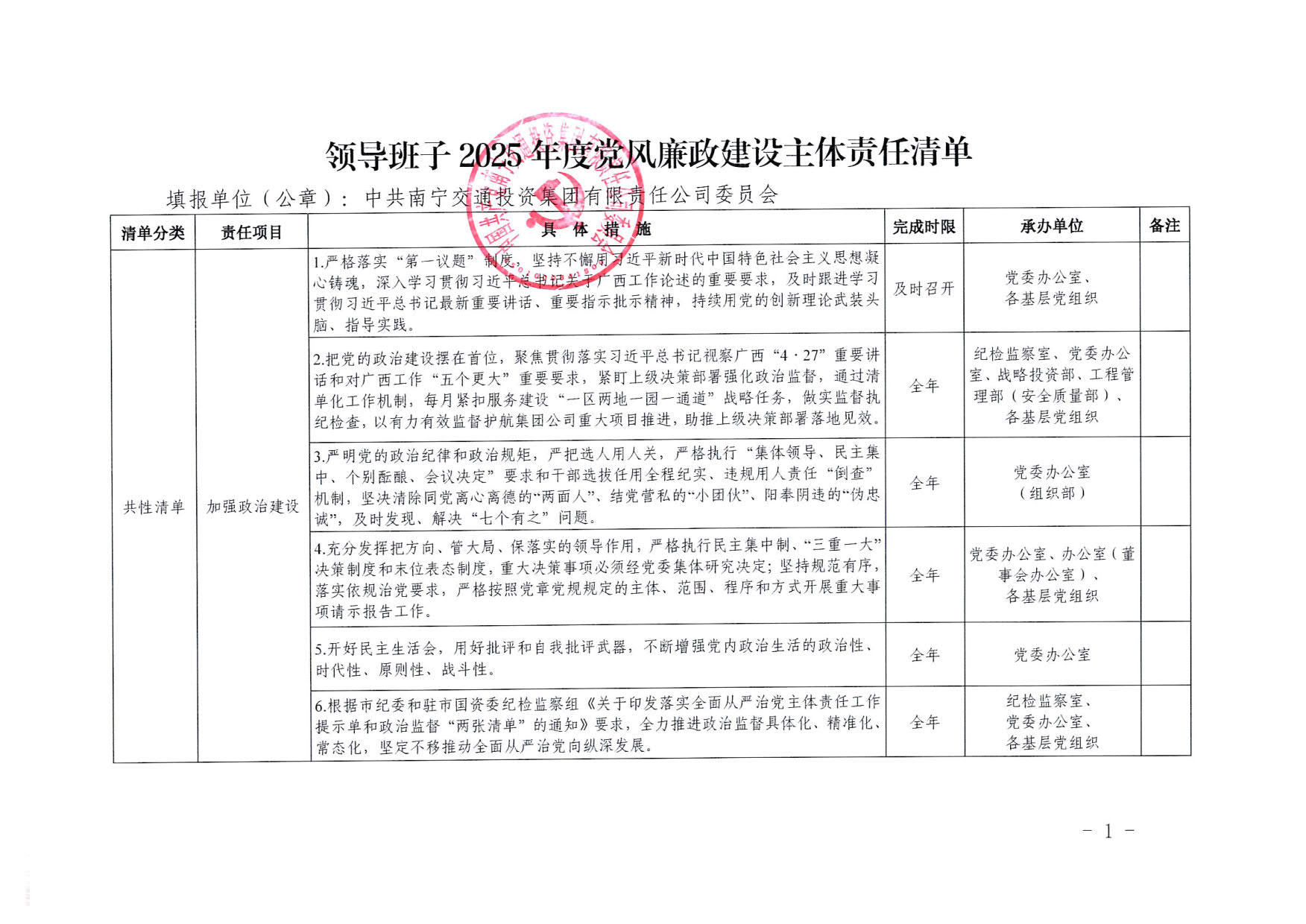 南寧交投集團領導班子2025年度黨風廉政建設主體責任清單