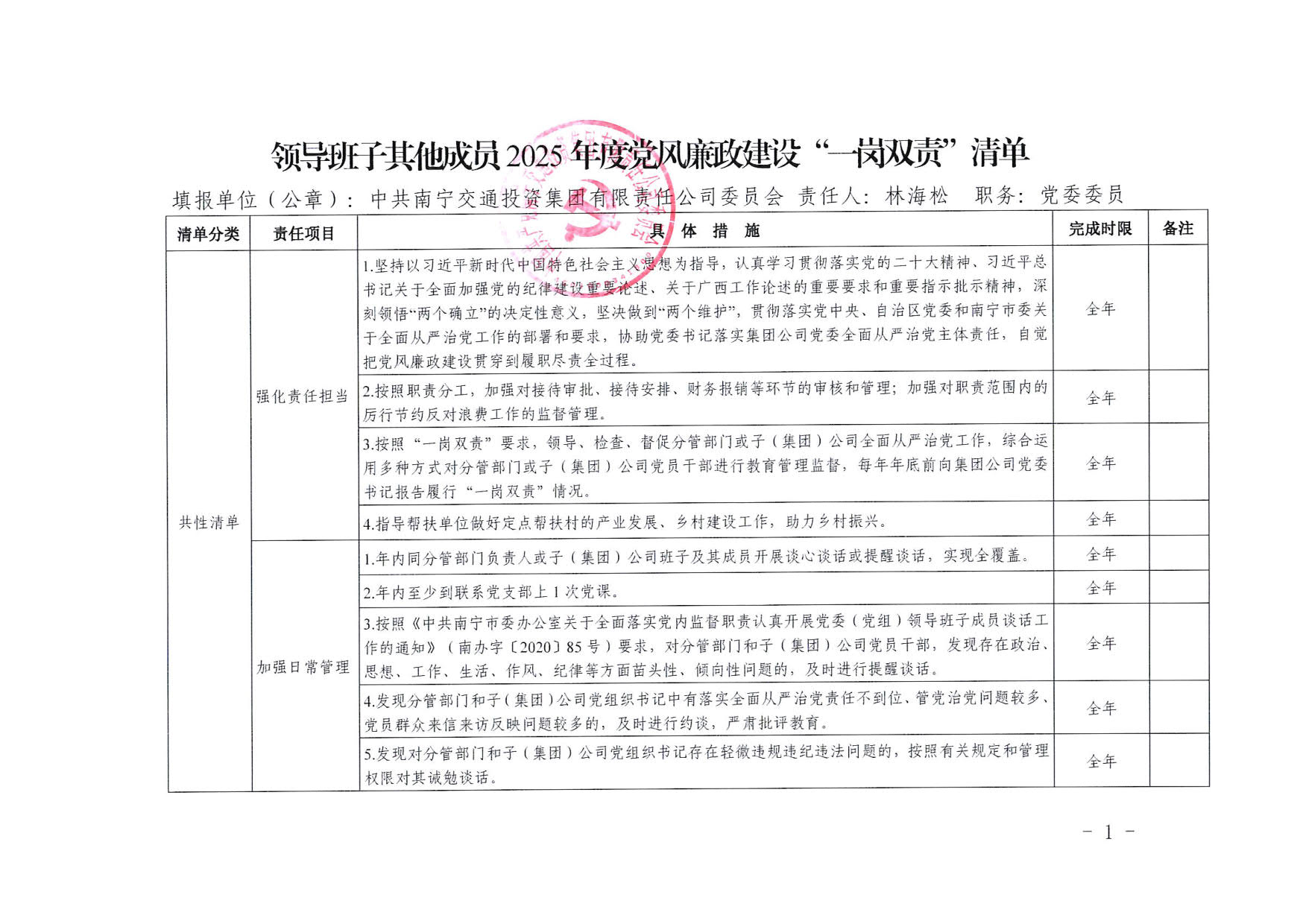 南寧交投集團(tuán)領(lǐng)導(dǎo)班子其他成員2025年度黨風(fēng)廉政建設(shè)“一崗雙責(zé)”清單(二)
